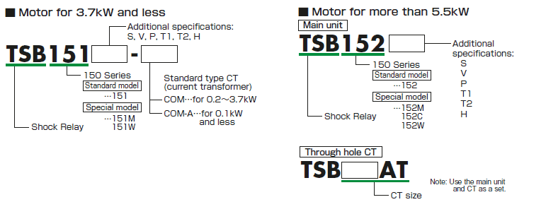 | For motors 3.7kW or less | For common type CT TSB151 | For motors of 5.5kW or more | Penetrating CT for TSB152 |