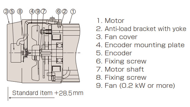 - A rotary encoder can be installed on the shaft end of the non-load side of a three-phase motor, enabling the motor rotation signal to be output.