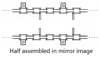 Chain length varies within the tolerance (total length tolerance). However, when using two chains side by side, there are cases where you want to align the relative positions as closely as possible depending on the application (for example, when connecting both chains with a jig such as a slat). In such cases, if you specify "total length combination" when ordering, we can measure the total length of each chain and manufacture it so that the relative difference between the left and right chains is minimal. Also, if the attachment mounting spacing is unusual or if attachments like those shown in the diagram below are attached, the positions of the facing attachments will be misaligned when used side by side. In such cases, if you specify "half-assembled in mirror image, Mirror Image" when ordering, we will manufacture a set of chains so that the attachments are symmetrical.
