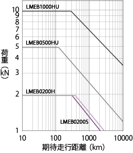 | A14 | The expected lifespan of Lift Master is determined by the expected running life of the screws. Trapezoidal Screw type (LMEM) The expected life span is determined when the total travel distance reaches 5km, regardless of the lifting load (reference value).Ball screw type (LMEB) The lifespan of Ball screw is determined by flaking caused by fatigue on the rolling surface. Please check the approximate lifespan in the graph below.However, if there is a lot of impact or if proper lubrication and maintenance are not performed, the expected travel distance will be significantly reduced. Expected travel distance (km) = Actual load stroke (m) × frequency of use (times/day) × number of operating days/year × 10-3 × expected years The expected lifespan varies depending on the lifting load.If the load fluctuates significantly during the stroke, calculate the equivalent load using the following formula. PM = PMIN + 2 × PMAX3 P M: Equivalent load N P MIN: Minimum load N P MAX: Maximum load N ・This graph shows travel distance based on the L10 life of Ball screw (the life that 90% or more of the total will reach).- If there are many impacts or if proper lubrication and maintenance are not performed, the expected travel distance will be significantly reduced. ・If a longer life is required, we will consider changing Ball screw to suit the load conditions. ![]() |
