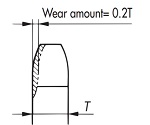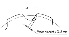 Use Figure 1 as a guide for the wear limit of the sprocket tooth surface. Depending on the size, the lifespan is 3 to 6 mm.